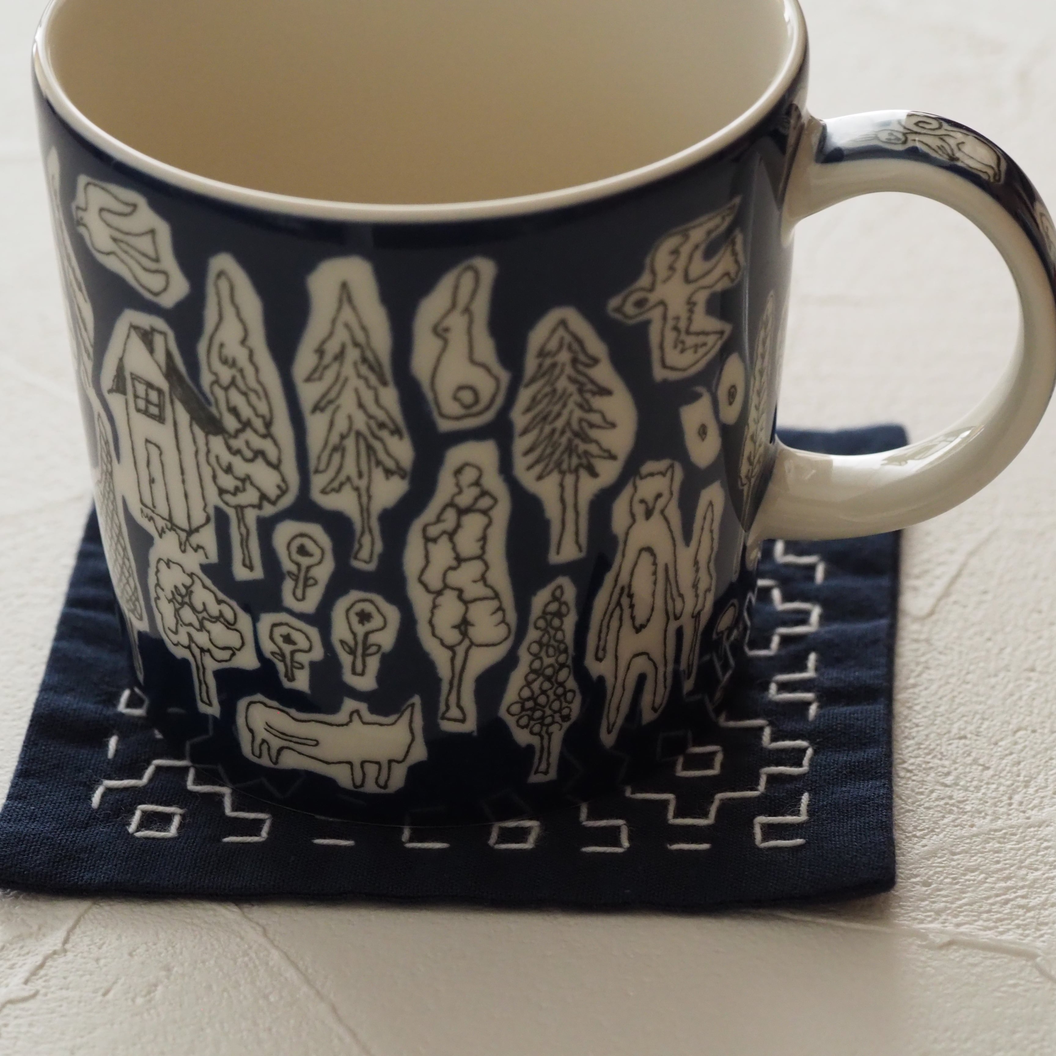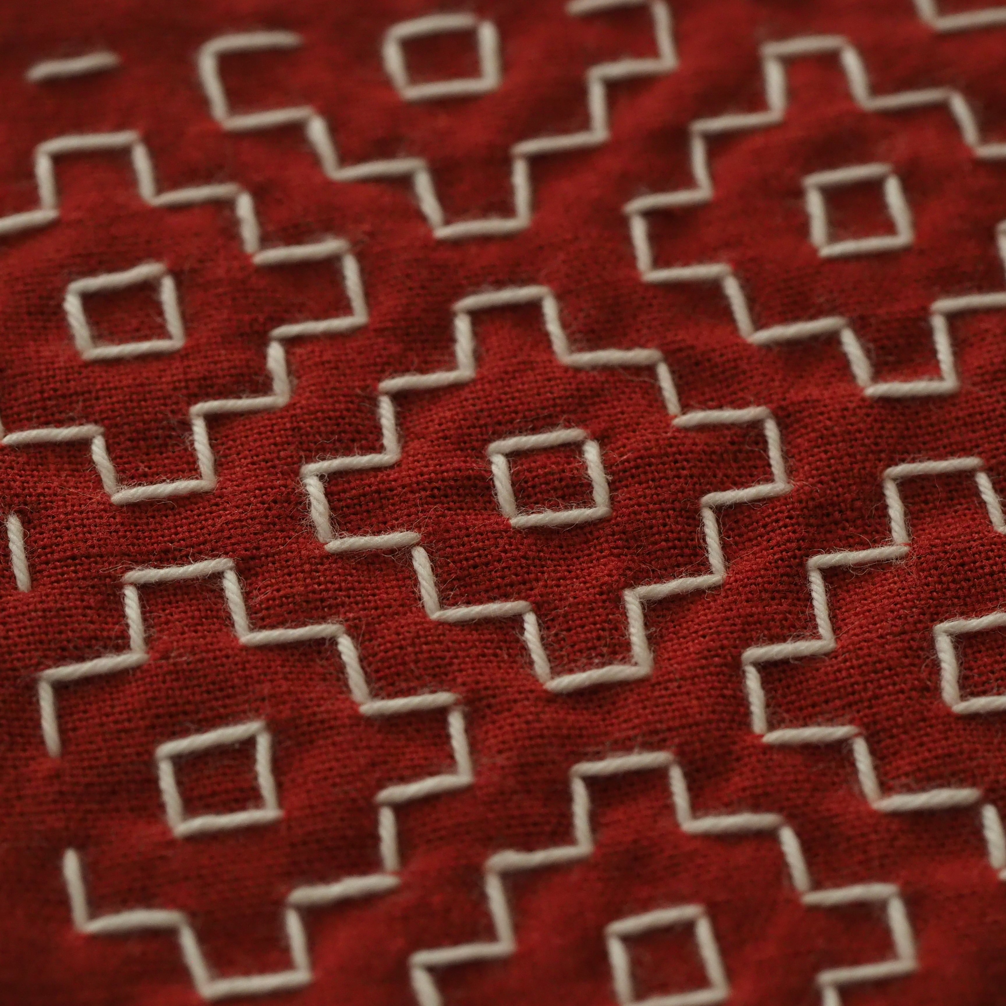 刺し子の一目刺しの技法で柿の花模様を施したコースターです。